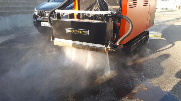 서울시가 물을 고압으로 분사해 '투수블록'을 청소하는 장비를 국내 최초로 도입해 올해 7월까지 8개 자치구의 13개 노선에서 운용한다고 25일 밝혔다. 투수블록은 일반 보도블록과 달리 물을 흡수하는 기능성 포장재로, 보도에 물이 넘치거나 고이지 않도록 하는 데 도움을 준다. 사진은 고압살수장비를 이용한 물청소 모습.