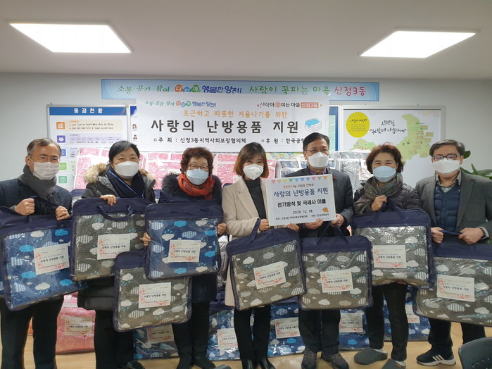 서울 양천구 신정3동 지역사회보장협의체가 22일부터 순차적으로 저소득 45가구 주민들에게 전기방석, 극세사 이불 등 난방용품을 지원한다. 사진은 전달식에서 관계자들이 기념촬영을 하는 모습. (사진제공=양천구청)