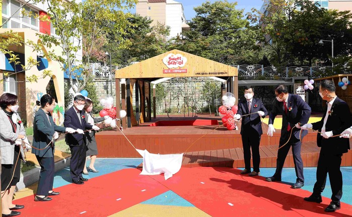 1호 ‘스위트스쿨’은 방곡초등학교 내 공터 일부를 활용해 약 493㎡ 규모로 만들어졌다. 이번 ‘스위트스쿨’의 이름은 ‘다행복 놀이터’로, 방곡초등학교 학생들이 직접 이름을 지었다.