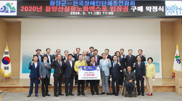 함양군은 11일 오전 11시 군청 대회의실에서 한국장애인단체총연합회(상임대표 김광환)와 엑스포 입장권 5,000매 구매 약정식을 체결했다.