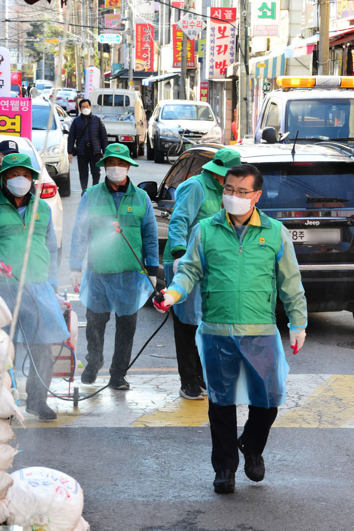 중랑구는 최근 코로나19 지역사회 전파를 방지하기 위해 새마을방역봉사반과 함께 일제 방역에 돌입했다. 사진은 상봉2동에서 류경기 구청장이 새마을방역봉사반 주민들과 방역활동을 하고 있는 모습. (사진제공=중랑구청)