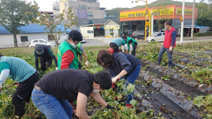 경기 동두천시 보산동 새마을남녀지도자회는 최근 이틀간 보산동 행정복지센터 뒤 텃밭에서 사랑의 고구마를 수확했다. 고구마 판매 수익금은 지역내 저소득가정, 홀몸노인 등을 돕는 재원으로 사용할 예정이다. 사진은 봉사자들이 고구마를 수확하고 있는 모습. (사진제공=동두천시청)