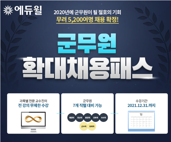 20021년까지 2년간 수강할 수 있는 ‘군무원 확대채용패스’ 과정에 대한 자세한 내용은 에듀윌 홈페이지에서 찾아볼 수 있다.