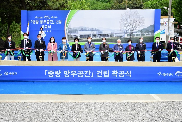 류경기 서울 중랑구청장은 지난 27일 ‘중랑망우공간’ 착공식에 참석했다. 중랑망우공간은 망우리공원을 서울 대표 역사문화공원으로 조성하기 위한 거점 시설로, 규모는 지상 2층·연면적 1247㎡다. 사진은 착공식에서 류 구청장(가운데)이 관계자들과 테이프 커팅을 하고 있는 모습. (사진제공=중랑구청)