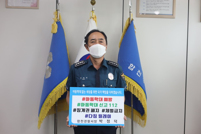 한편, 박정덕 합천경찰서장은 유동인구가 많은 공공장소에 아동학대예방 플래카드를 게시하고 합천읍 중앙사거리 전광판을 활용해 공익광고를 송출하는 등 아동학대 인식 개선을 위한 캠페인을 진행하였으며 ‘학대 없는 세상을 위한 국가책임을 다하기 위해 노력하겠다’고 밝혔다.