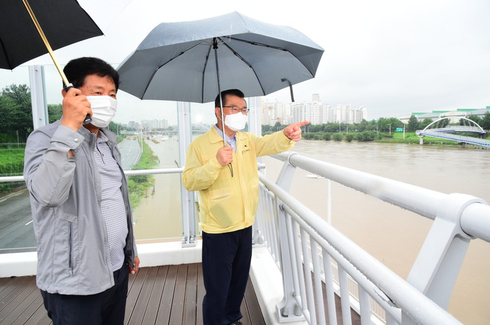 류경기 서울 중랑구청장이 3일 오후 중랑천 인근 중화동 제2연육교와 중랑천 제방을 긴급 점검했다. 이번 현장 점검은 연일 이어지는 집중호우로 인한 피해를 예방하고자 마련됐다. 사진은 류 구청장(오른쪽)이 중랑천 인근 중화동 제2연육교와 중랑천 제방을 점검하고 있는 모습.(사진제공=중랑구청)