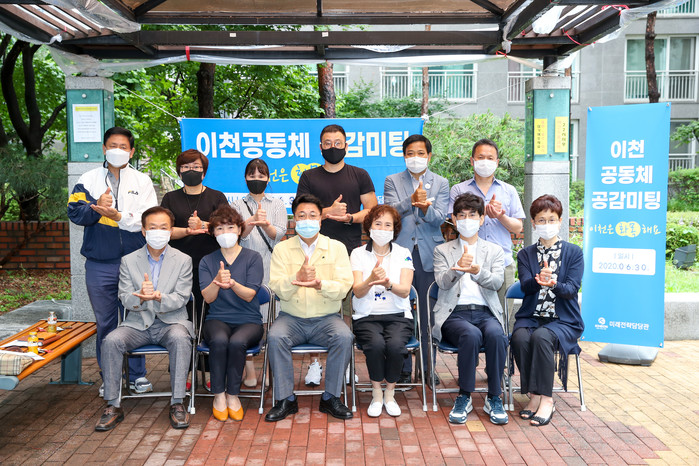 엄태준 경기 이천시장은 지역내 4곳 아파트 주민들과 7월 첫주차 소규모 공감미팅 ‘이천은 화목해요’를 진행했다. 공감미팅은 매주 화·목요일 지역내 아파트 주민들을 찾아가 대화하며 여론을 청취하는 소통릴레이다. 사진은 엄 시장과 주민들이 공감미팅을 하고 기념촬영을 하는 모습. (사진제공=이천시청)