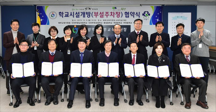 인천 부평구는 9일 북부교육지원청 소회의실에서 부원초, 부평남초, 부흥중, 동암중, 부원중 등 5개 학교 관계자들과 학교 주차장 개방 협약을 체결했다. 사진은 차준택 구청장(앞줄 왼쪽에서 세 번째)과 학교 관계자들이 기념촬영을 하는 모습. (사진제공=부평구청)