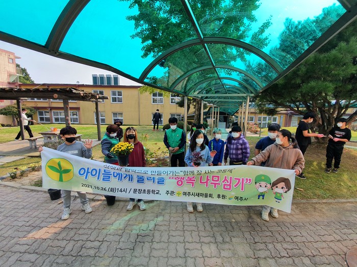 경기 여주시새마을회는 지난 26일 흥천면에 위치한 문장초등학교에서 교직원 및 5·6학년 아이들과 함께 ‘행복 나무심기 행사’를 진행해 수국·청하쑥부쟁이 등을 식재했다. 사진은 이날 참여한 아이들이 기념촬영을 하는 모습. (사진제공=여주시청)