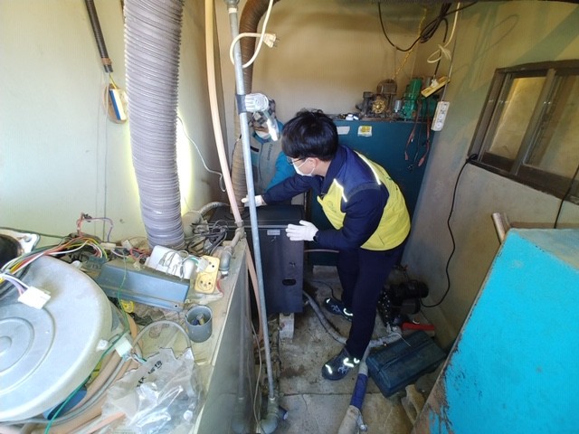 경기 포천시무한돌봄희망복지센터가 11일 한전KPS 포천사업소와 함께 한파 취약 노인을 대상으로 난방비 지원 및 노후 보일러 교체·수리하는 ‘온기(溫技)Dream 사업’을 추진했다. 사진은 봉사자가 노후 보일러를 수리하고 있는 모습. (사진제공=포천시청)