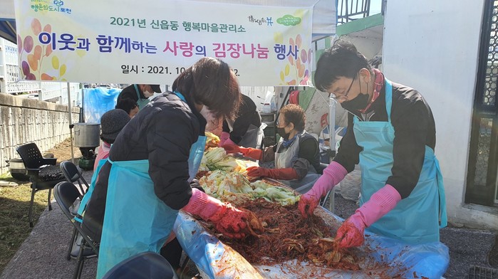 경기 포천시 신읍동 행복마을관리소는 최근 이틀간 ‘김장 나눔’ 행사를 개최해 직접 김장을 담가 코로나19로 어려움을 겪고 있는 홀몸노인 등 복지 사각지대에 있는 50여가구에 전달했다. 사진은 봉사자들이 김치를 만들고 있는 모습. (사진제공=포천시청)