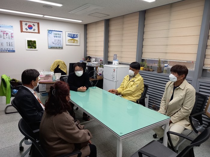 경기 여주시 금사면이장협의회는 9일 곽호영 금사면장과 함께 코로나19 지역확산 방지에 힘쓰고 있는 여주시 보건소와 시민안전과 등을 방문해 감사의 마음을 담은 떡 6말을 격려품으로 전달하고 직원들을 격려했다. 사진은 이장협의회가 방역 관계자들을 방문, 격려하고 있는 모습. (사진제공=여주시청)