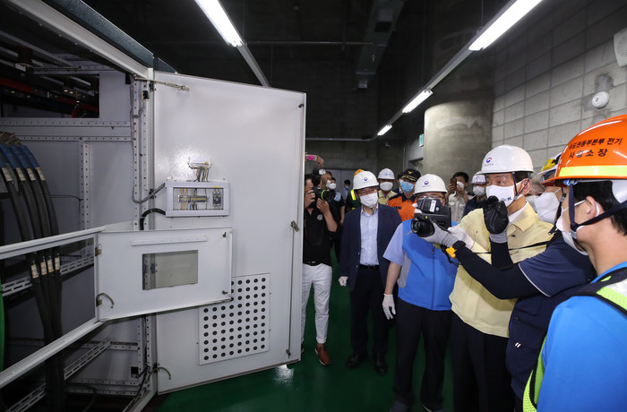 진영 행정안전부 장관이 22일 서울 강남구청역 분당선 역사에서 국가안전대진단 현장 점검을 하며 열화상 카메라로 변전 시설 온도를 확인하고 있다.