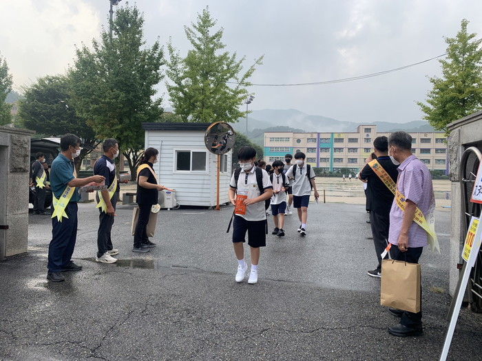 경기 포천시 신북면 청소년지도협의회는 최근 신북면행정복지센터·신북파출소와 함께 포천중학교 학생들의 하교 시간에 맞춰 KF94 마스크와 홍보물을 나눠주며 학교폭력 예방 및 사회적 거리두기 민·관합동 캠페인을 전개했다. 사진은 이날 캠페인에서 학생들에게 마스크를 나눠주고 이 있는 모습. (사진제공=포천시청)