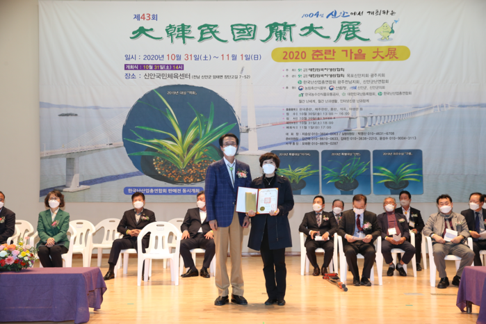 신안군(군수 박우량)은 지난 31일에 “2020 춘란 가을대전(大展)” 개막식을 시작으로 2일간에 걸쳐 바다위의 정원 1004섬 신안군에서 전국의 춘란 희귀 엽예품들이 신안국민체육센터 한자리에 모였다.