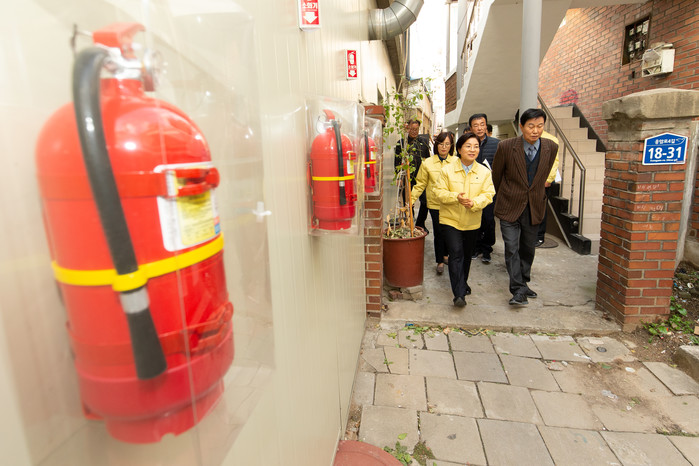 서울 은평구는 최근 화재가 빈번히 발생하는 동절기 도래에 따라 화재취약가구 및 노인복지관, 전통시장 등을 대상으로 현장점검을 했다. 사진은 김미경 구청장(앞줄 왼쪽)과 관계자들이 응암동 일대를 돌아다니며 현장점검을 하는 모습. (사진제공=은평구청)