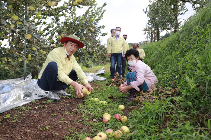 전남 보성군은 3일 제9호 태풍 ‘마이삭’으로 낙과 피해가 발생한 과수 농가를 찾아 피해 상황을 점검했다. 사진은 김철우 군수가 낙과 피해를 입은 농가를 찾아 위로하고 있는 모습. (사진제공=보성군청)