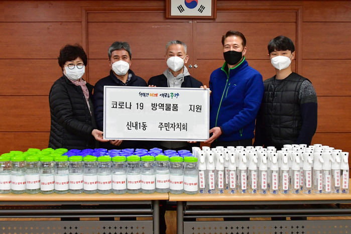 중랑구 신내1동 주민자치회가 지난 6일 코로나19 소독용 분사형 스프레이 및 약품(300ml) 110개를 중랑구에 기부했다. 사진은 전달식에 참석한 관계자들이 기념촬영을 하는 모습. (사진제공=중랑구청)