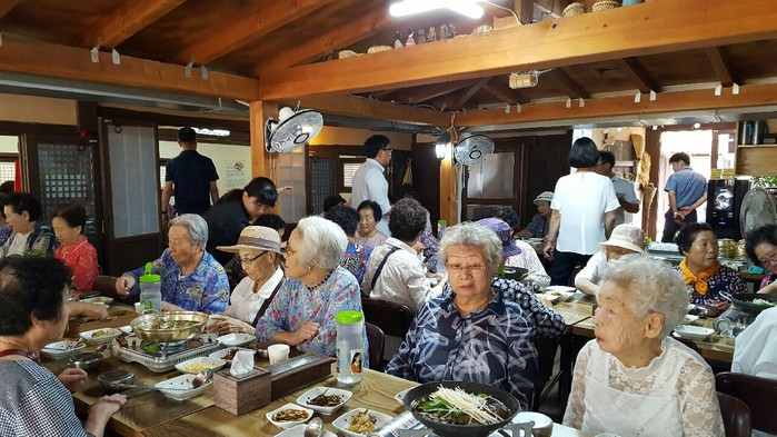 충남 아산시 신창면 삼육희망나눔봉사회는 28일 신창면 행복키움추진단과 함께 생일을 맞은 홀몸노인을 위해 생일상을 차렸다. 이날 봉사자들은 노인들에게 미역국 등의 음식을 대접했다. 사진은 노인들이 식사를 하고 있는 모습. (사진제공=아산시청)
