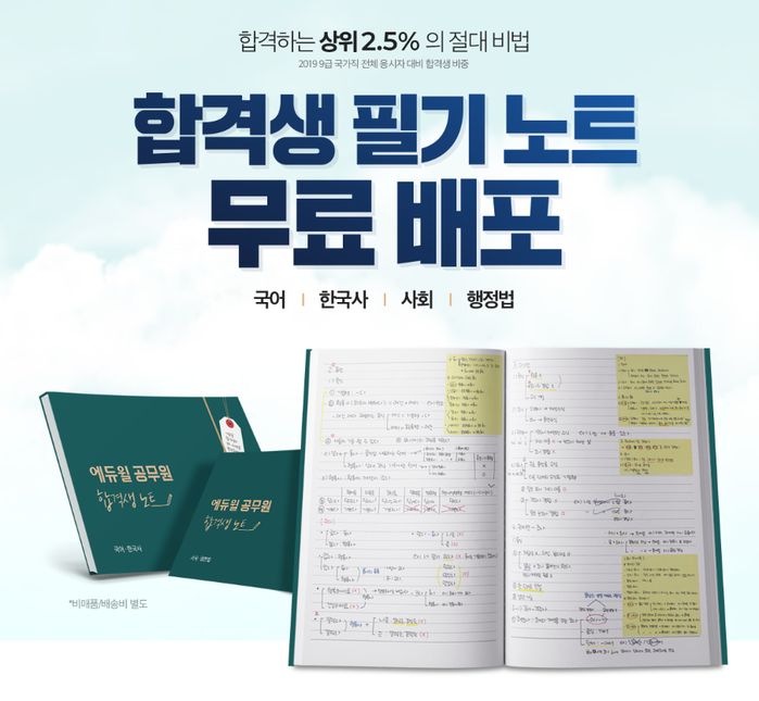 [시민일보 = 황혜빈 기자]종합교육기업 에듀윌(대표 박명규)은 9급 공무원 시험에 합격하는 상위 2.5%의 비법을 담은 ‘합격생 필기노트’를 무료로 배포한다고 3일 밝혔다.