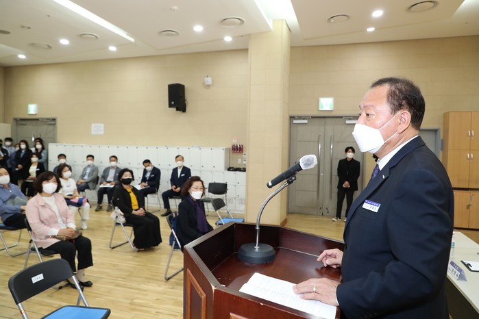마포구는 25일 '한류·공연관광 콤플렉스 건립공사'를 위한 주민설명회를 개최했다. 한류·공연관광 콤플렉스는 한류 중심의 공연 전문시설로, 마포 유수지 시설 및 공영주차장 부지에 조성될 예정이다. 사진은 주민설명회에서 유동균 구청장(오른쪽)이 인사말을 하고 있는 모습. (사진제공=마포구청)