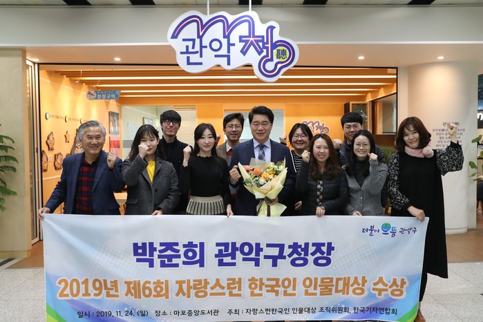 박준희 서울 관악구청장이 최근 마포중앙도서관 6층 대강당에서 열린 ‘2019년 제6회 자랑스런 한국인 인물대상’ 시상식에서 행정발전공헌 부문 대상을 받았다. 사진은 박 구청장(앞줄 왼쪽에서 네 번째)과 직원들이 기념촬영을 하는 모습. (사진제공=관악구청)