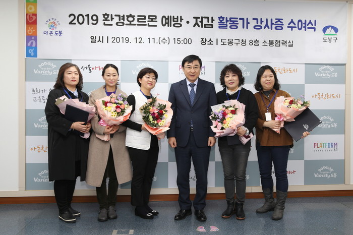 서울 도봉구는 11일 구청 소통협력실에서 '환경호르몬 예방 코디네이터 및 환경보건 분야 강사 양성과정'을 수료한 환경호르몬 예방·저감 교육활동가들에게 강사증을 수여했다. 사진은 이동진 구청장(오른쪽에서 세 번째)과 함께 기념촬영을 하는 모습. (사진제공=도봉구청)