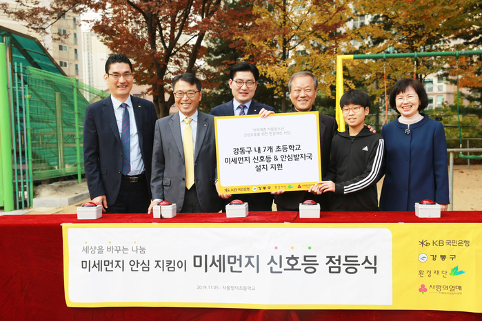 5일 이정훈 서울 강동구청장이 날로 심각해지는 미세먼지로부터 아동·청소년 건강을 보호하기 위한 환경개선 사업인 '미세먼지 신호등 점등식'에 참석했다. 사진은 명덕초등학교에서 진행된 점등식에 참서석한 이정훈 구청장(왼쪽에서 세 번째)이 기념촬영을 하고 있는 모습. (사진제공=강동구청)