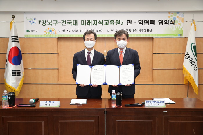 강북구가 구민에게 양질의 평생학습 기회를 제공하고자 최근 건국대학교 미래지식교육원과 평생교육 교류 협력을 위한 업무협약을 체결했다. 사진은 이날 협약 체결 후 박겸수 구청장(왼쪽)과 장성호 교육원장이 협약서를 들고 기념촬영을 하는 모습. (사진제공=강북구청)