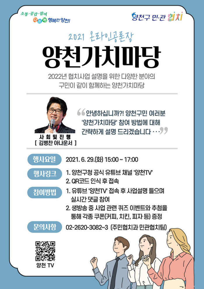 양천가치마당은 주민 누구나 참여 가능하며, 당일에 ‘유튜브’에서 ‘양천구청’ 검색 후 생방송으로 시청하면서 댓글로 함께 공론장에 참여할 수 있다. 생방송에서는 의제별 사업 제안자가 2022년 민관협치 의제에 대한 사업 설명 후 질의 응답하는 시간, 퀴즈 이벤트 등이 풍성하게 구성될 예정이다. 구는 6월 27일까지 양천구 페이스북을 통해 양천가치마당 사전 이벤트 ‘내가 생각하는 양천구의 자랑은 000이다’를 진행하며 주민의 관심을 유도하고 있다.