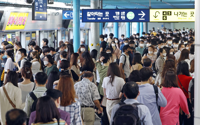 기록적인 폭우로 서울 시내 주요 도로 등이 통제됨에 따라 서울 시내 지하철 및 버스가 증편된다. 서울시는 호우특보가 해제될 때까지 출·퇴근 시간대와 막차 시간을 30분씩 연장해 지하철과 버스를 증편한다고 밝히고 시민들의 출·퇴근 시간대 대중교통 이용을 당부했다. 사진은 10일 오전 서울 신도림역에서 지하철을 이용하는 시민들의 모습.