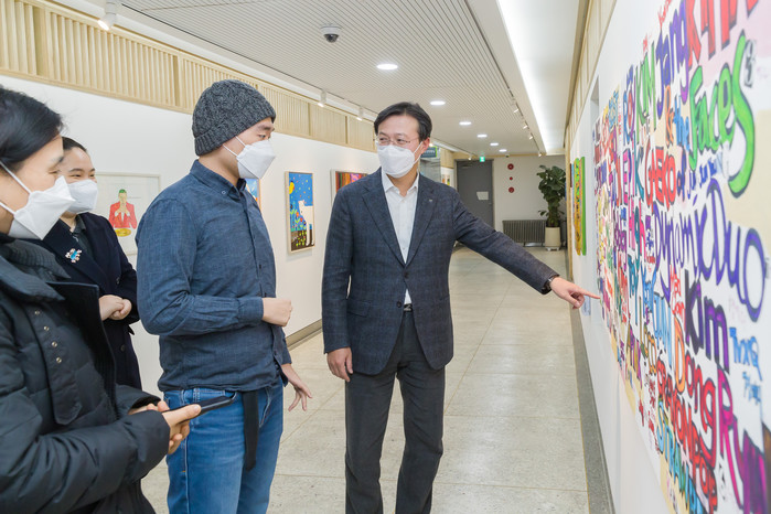 영등포구가 최근 구청 본관 3층 복도에 조성한 갤러리에 새로운 전시를 시작했다. 구는 발달장애 작가들(금채민, 김기정, 이규재, 이다래, 정도운)과 청년 작가들(김나율, 김혜리, 은희준)의 다채로운 세계가 담긴 작품 총 24점이 전시되는 ‘가능성의 예술展’을 오는 6월30일까지 연다. 사진은 정도운 작가에게 직접 작품소개를 듣고 있는 채현일 구청장(맨 오른쪽)의 모습. (사진제공=영등포구청)