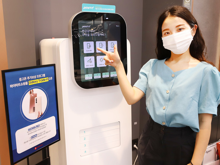 ▲ 롯데하이마트 대치점에서 모델이 민팃 ATM 기기 앞에서 ‘삼성 신규폰 구매고객 대상 민팃 추가 보상 프로그램’ 행사를 소개하고 있다. (사진제공=롯데하이마트) |