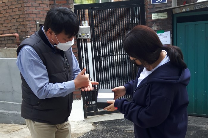 경기 수원시 팔달구 우만1동은 최근 코로나19 현장에서 최선을 다하고 있는 의료인·시민·공직자들을 격려하기 위해 시에서 마련한 ‘덕분에’ 수어(수화 언어) 조각을 지역내 주민 2명에게 전달했다. 사진은 우만1동 관계자가 성금을 기부한 개성손만두 강중구 대표(왼쪽)에게 '덕분에' 수어 조각을 전달하고 있는 모습. (사진제공=수원시청)