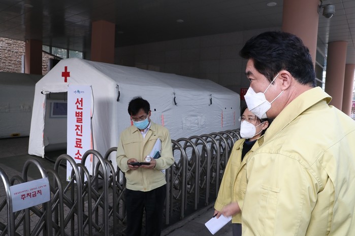 관악구는 최근 우한폐렴 대응 긴급 2차 회의를 개최하고 중국인이 다수 거주하고 있는 신사동 주민센터 옆에 임시선별소를 설치해 매일 오전 9시~오후 6시 운영하기로 결정했다. 사진은 박준희 구청장(오른쪽)이 임시선별소를 살펴보는 모습. (사진제공=관악구청)