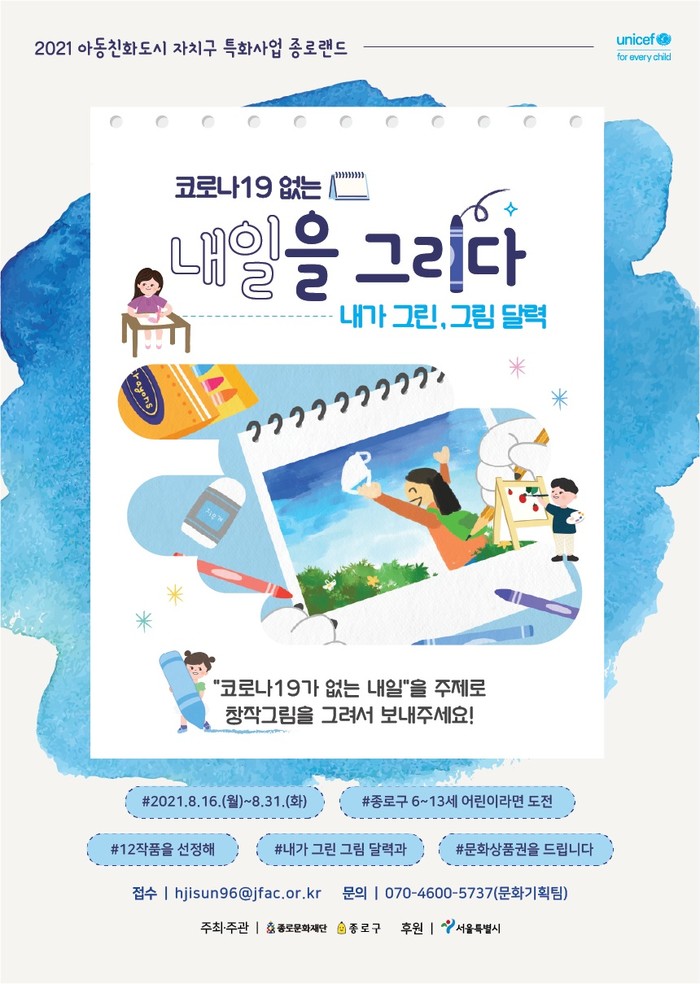 공모전은 지역내 거주 중인 6~13세 어린이 누구나 참여할 수 있으며, 방법은 오는 31일까지 종로문화재단 홈페이지에서 신청서를 내려 받아 작품 원본과 함께 담당자 전자우편(hjisun96@jfac.or.kr)으로 제출하면 된다. 이때 작품 전체가 보이는 사진을 찍어 반드시 함께 첨부해야 한다.