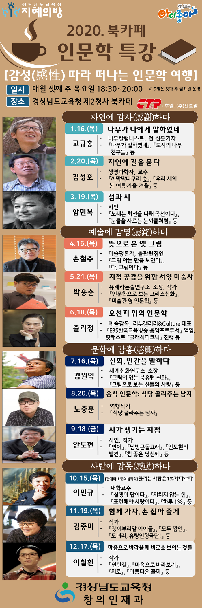 월별 강연은 △2월-자연에 길을 묻다(김성호 생명과학자) △3월-섬과 시(함민복 시인) △4월-뜻으로 본 옛 그림(손철주 미술평론가) △5월-지적 공감을 위한 서양 미술사(박홍순 작가) △6월-오선지 위의 인문학(쥴리정 예술감독) △7월-신화, 인간을 말하다(김원익 세계신화연구소 소장) △8월-음식 인문학: 식당 골라주는 남자(노중훈 여행작가) △9월-시가 생기는 지점(안도현 시인) △10월-끌리는 사람은 1%가 다르다(이민규 교수) △11월-함께 가자, 손 잡아 줄게(김중미 작가) △12월-마음으로 바라볼 때 비로소 보이는 것들(이철환 작가)이다.