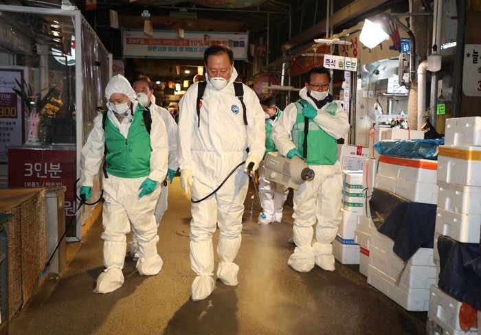 유동균 서울 마포구청장이 4일 이른 새벽 아현시장에서 새마을지도자 자율방역대 회원들과 함께 방역활동을 진행했다. 사진은 유 구청장(가운데)과 새마을지도자 자율방역대 회원들이 아현시장 일대를 방역하고 있는 모습. (사진제공=마포구청)
