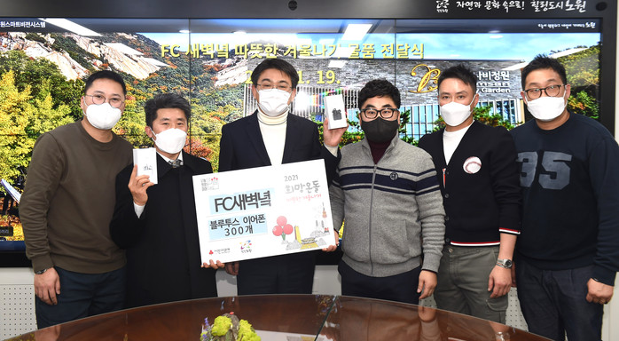 노원구는 19일 FC새벽녘으로부터 지역내 저소득층 청소년을 위한 블루투스 이어폰 300개(750만원 상당)를 따뜻한 겨울나기 물품으로 전달받았다. 사진은 전달식에서 오승록 구청장(왼쪽에서 세 번째)과 관계자들이 기념촬영을 하는 모습. (사진제공=노원구청)