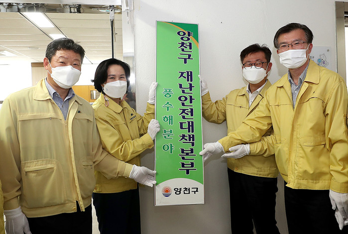 서울 양천구는 지난 5월14일 2021년 여름철 풍수해 대비 재난안전대책본부 개소식을 개최했다. 구는 오는 10월15일까지 24시간 비상근무체제에 돌입해 여름철 태풍·호우에 대한 준비된 계획을 시행한다. 사진은 개소식에서 김수영 구청장(왼쪽에서 두 번째)이 현판을 달고 있는 모습. (사진제공=양천구청)