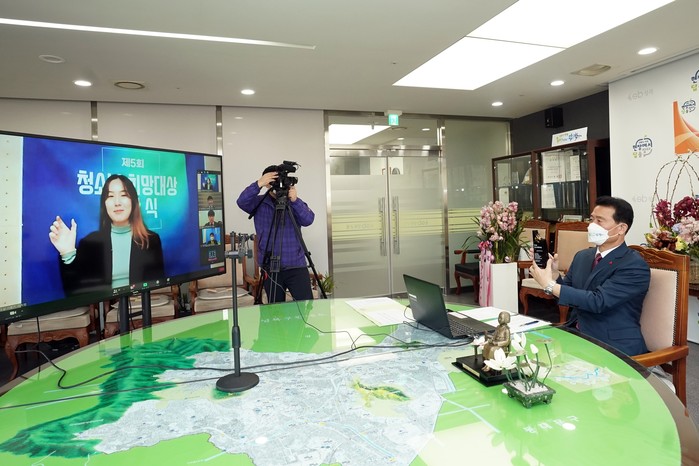 이승로 서울 성북구청장이 28일 한국청소년재단이 주관하는 ‘제5회 청소년희망대상’ 기초자치단체장 부문 대상을 받았다. 이 구청장은 청소년의 교육 및 복지증진과 인권향상 그리고 청소년의 삶을 개선하는 데 기여한 공로를 인정받았다. 사진은 이 구청장(오른쪽)이 온라인으로 수상을 하는 모습. (사진제공=성북구청)