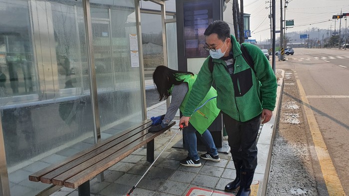 경기 동두천시 상패동 새마을협의회는 17일 코로나19 확산 방지를 위해 동남아파트~28사단, 상패동 행정복지센터~신한대학교 구간에 위치한 19개의 버스정류장을 대상으로 자체 방역을 실시했다. 사진은 버스정류장을 소독하고 있는 모습. (사진제공=동두천시청)