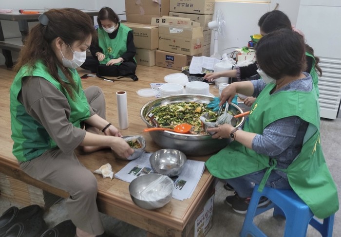 경기 동두천시 중앙동 새마을부녀회와 지역사회보장협의체는 최근 사랑의 밑반찬 나눔을 실시해 직접 만든 반찬과 착한식당인 '쭈니네 밥집'에서 후원한 제육볶음을 지역내 홀몸노인 30여가구에 비대면으로 전달했다. 사진은 이날 봉사자들이 열무김치를 만들고 있는 모습. (사진제공=동두천시청)
