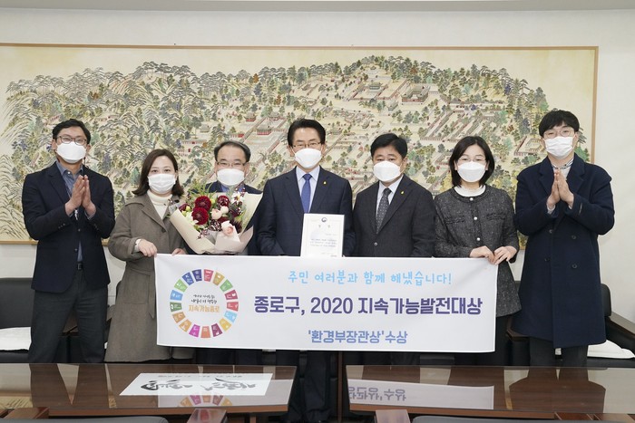 서울 종로구는 최근 환경부 주최·전국지속가능발전협의회 주관 ‘2020 지속가능발전대상 공모전’ 시상식에서 환경부장관상을 받았다. 사진은 김영종 구청장(가운데)과 관계자들이 기념촬영을 하는 모습. (사진제공=종로구청)