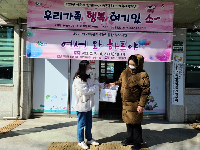 합천군(군수 문준희) 건강가정다문화센터에서 긍정적인 부모성장을 촉진하기 위해 2월 9일 ~ 23일 매주 화요일 합천군 내 임신 중이거나 12개월 내 아기를 양육하고 있는 가정을 대상으로 임신출산 교육키트를 비대면으로 제공한다.