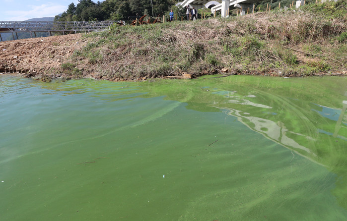 7일 조류경보 '경계' 단계가 발령된 대청호 문의수역 인근 대청호가 초록빛을 띠고 있다.