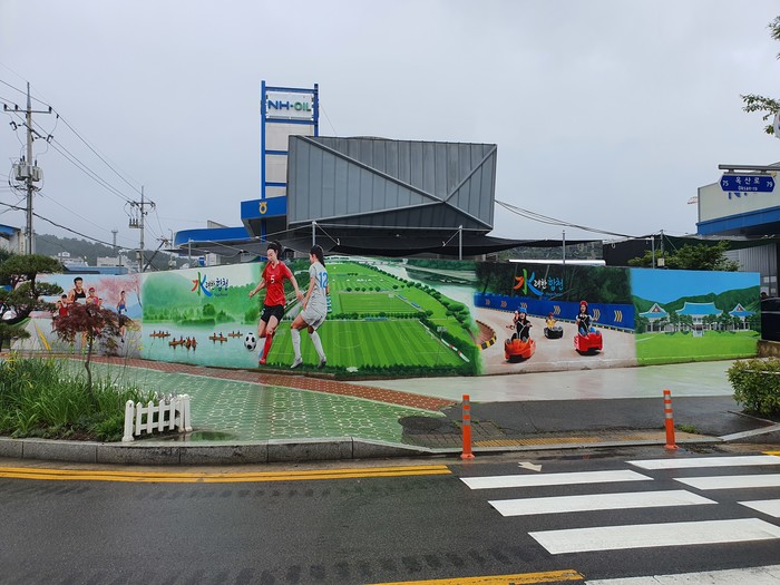 이번 벽화 정비 사업은 73㎡의 면적에 합천을 대표할 만한 벚꽃마라톤, 황강 카누, 군민체육공원 축구장, 루지, 청와대세트장 그림들을 생동감 있게 그려 넣었다.