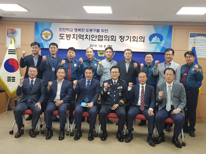 도봉구는 최근 도봉경찰서에서 민·관·경 협의체로 구성된 지역치안협의회 정기회의를 개최, 폐쇄회로(CC)TV 확대 설치 등의 지역현안에 관해 논의했다. 사진은 이동진 구청장(앞줄 왼쪽 세 번째)과 참석자들이 기념촬영을 하는 모습. (사진제공=도봉구청)