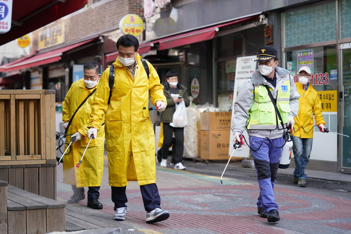최근 서울 성북구 정릉3동에서 이승로 구청장을 비롯한 지역주민, 국민대학교 교직원 및 학생, 공무원 등 120여명이 정릉시장 및 국민대 유학생 등이 거주하는 정릉생활관 일대에서 합동 방역활동을 했다. 사진은 이 구청장이 방역활동에 참여하는 모습. (사진제공=성북구청)