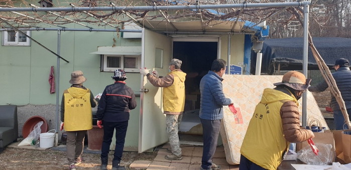 경기 연천군 미산면지역사회보장협의체가 7일 미산면 삼화리에 거주하는 저소득 취약계층 가정을 대상으로 도배와 장판 교체 등의 '사랑의 집 고쳐주기 사업'을 추진했다. 사진은 이날 봉사자들이 도배·장판 등 집수리와 외부 환경 정비를 하고 있는 모습. (사진제공=연천군청)